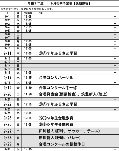 2025.08.27学校行事後期課程 学校行事のお知らせ 9月田川地区中学校総合体育大会 陸上競技大会兼筑豊地区中学校総合体育大会 陸上競技大会前期課程 学校行事のお知らせ 9月関連記事 2学期始業式 前期課程 学校行事のお知らせ 4月 前期課程 学校行事のお知らせ 7月 前期課程 学校行事のお知らせ 8月 1学期終業式 研究発表会 第2回卒業証書授与式 前期課程 学校行事のお知らせ 5月 前期課程 学校行事のお知らせ 6月 薬物乱用防止教室 前期課程 学校行事のお知らせ 10月 後期課程 学校行事のお知らせ 5月 1学期終業式 前期課程 学校行事のお知らせ 9月 着任式、始業式 3年生豆腐作り体験 藤光謙司氏講演会 7年生みんなで新聞紙バッグの製作 自然教室に行ってきました! 田植え体験 1学期終業式 後期課程 学校行事のお知らせ 3月 後期課程 学校行事のお知らせ 4月 職場体験学習 マナー講座 9年生私立高校説明会 前期課程 学校行事のお知らせ 3月 8年生企業講演会 職場体験学習発表会 令和7年度 年間スケジュール 職場体験学習 商工会の方からの説明