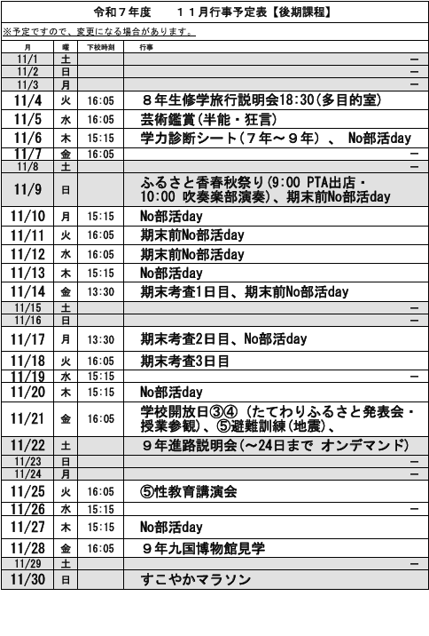 2025.10.24学校行事後期課程 学校行事のお知らせ 11月第70回日本PTA九州ブロック研究大会福岡市大会関連記事 1学期終業式 後期課程 学校行事のお知らせ 10月 1学期終業式 1学期終業式 第2回卒業証書授与式 9年生私立高校説明会 前期課程 学校行事のお知らせ 8月 職場体験学習発表会 7年生みんなで新聞紙バッグの製作 着任式、始業式 2学期始業式 研究発表会 前期課程 学校行事のお知らせ 3月 前期課程 学校行事のお知らせ 7月 職場体験学習 商工会の方からの説明 前期課程 学校行事のお知らせ 9月 藤光謙司氏講演会 後期課程 学校行事のお知らせ 4月 前期課程 学校行事のお知らせ 6月 8年生企業講演会 後期課程 学校行事のお知らせ 7月 前期課程 学校行事のお知らせ 5月 前期課程 学校行事のお知らせ 10月 職場体験学習 マナー講座 後期課程 学校行事のお知らせ 9月 後期課程 学校行事のお知らせ 6月 薬物乱用防止教室 後期課程 学校行事のお知らせ 3月 令和7年度 年間スケジュール 地域学校協働活動「プランター花づくり」