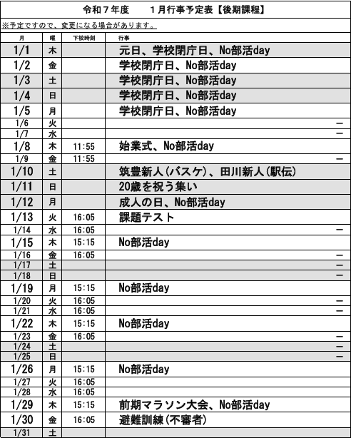 2025.12.19学校行事後期課程 学校行事のお知らせ 1月前期課程 学校行事のお知らせ 1月関連記事 後期課程 学校行事のお知らせ 3月 前期課程 学校行事のお知らせ 3月 前期課程 学校行事のお知らせ 4月 着任式、始業式 令和7年度 年間スケジュール 前期課程 学校行事のお知らせ 10月 後期課程 学校行事のお知らせ 11月 8年生企業講演会 後期課程 学校行事のお知らせ 12月 前期課程 学校行事のお知らせ 7月 1学期終業式 前期課程 学校行事のお知らせ 1月 前期課程 学校行事のお知らせ 5月 2学期始業式 後期課程 学校行事のお知らせ 10月 前期課程 学校行事のお知らせ 9月 1学期終業式 7年生みんなで新聞紙バッグの製作 研究発表会 職場体験学習発表会 前期課程 学校行事のお知らせ 6月 2学期始業式 地域学校協働活動「プランター花づくり」 前期課程 学校行事のお知らせ 8月 3年生豆腐作り体験 後期課程 学校行事のお知らせ 4月 前期課程 学校行事のお知らせ 12月 田植え体験 薬物乱用防止教室 前期課程 学校行事のお知らせ 10月