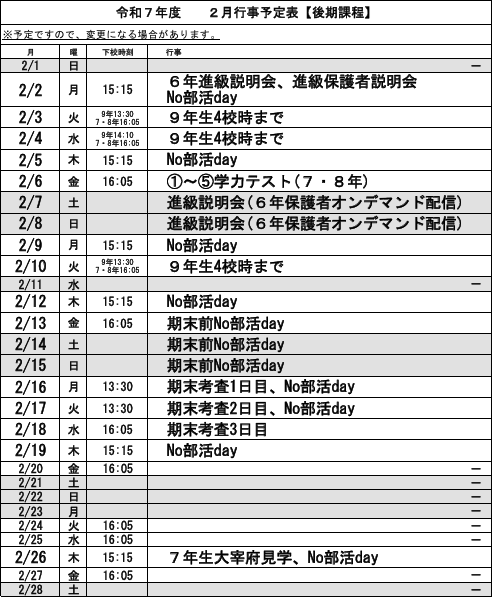 2026.01.28学校行事後期課程 学校行事のお知らせ 2月前期課程 学校行事のお知らせ 2月関連記事 7年生みんなで新聞紙バッグの製作 後期課程 学校行事のお知らせ 8月 後期課程 学校行事のお知らせ 5月 後期課程 学校行事のお知らせ 9月 1学期終業式 前期課程 学校行事のお知らせ 10月 第2回卒業証書授与式 後期課程 学校行事のお知らせ 1月 前期課程 学校行事のお知らせ 10月 職場体験学習発表会 自然教室に行ってきました! 令和5年度入学式 研究発表会 後期課程 学校行事のお知らせ 11月 職場体験学習 商工会の方からの説明 薬物乱用防止教室 後期課程 学校行事のお知らせ 3月 前期課程 学校行事のお知らせ 2月 地域学校協働活動「プランター花づくり」 前期課程 学校行事のお知らせ 9月 令和7年度 年間スケジュール 2学期始業式 田植え体験 前期課程 学校行事のお知らせ 7月 前期課程 学校行事のお知らせ 12月 1学期終業式 前期課程 学校行事のお知らせ 4月 後期課程 学校行事のお知らせ 12月 前期課程 学校行事のお知らせ 6月 後期課程 学校行事のお知らせ 4月