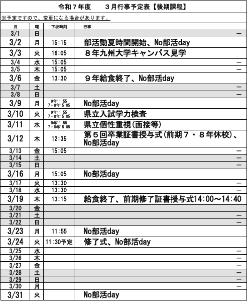 2026.02.25学校行事後期課程 学校行事のお知らせ 3月5年生学年PTA活動前期課程 学校行事のお知らせ 3月関連記事 薬物乱用防止教室 後期課程 学校行事のお知らせ 10月 7年生みんなで新聞紙バッグの製作 後期課程 学校行事のお知らせ 4月 職場体験学習発表会 第2回卒業証書授与式 前期課程 学校行事のお知らせ 10月 令和5年度入学式 前期課程 学校行事のお知らせ 6月 地域学校協働活動「プランター花づくり」 後期課程 学校行事のお知らせ 11月 2学期始業式 後期課程 学校行事のお知らせ 12月 前期課程 学校行事のお知らせ 10月 後期課程 学校行事のお知らせ 2月 後期課程 学校行事のお知らせ 9月 後期課程 学校行事のお知らせ 5月 前期課程 学校行事のお知らせ 4月 令和7年度 年間スケジュール 1学期終業式 着任式、始業式 自然教室に行ってきました! 1学期終業式 後期課程 学校行事のお知らせ 3月 前期課程 学校行事のお知らせ 1月 前期課程 学校行事のお知らせ 5月 前期課程 学校行事のお知らせ 3月 8年生企業講演会 前期課程 学校行事のお知らせ 8月 2学期始業式